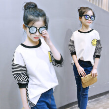 子供服の女の子のTシャツの长袖の子供の下の2019年の新型の中で大きな子供は色のストレープの上にある丸首の濡れている白の120をつづち合わせて身长の105-155 CMに适します。